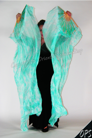 Die Schleier der Fächerschleier sind aus leichter reiner, qualitativ hochwertiger Seide, so dass sie wirklich bestens fliegen. Speziell für Seide entwickelte Farben betonen den eleganten Seidenglanz.
